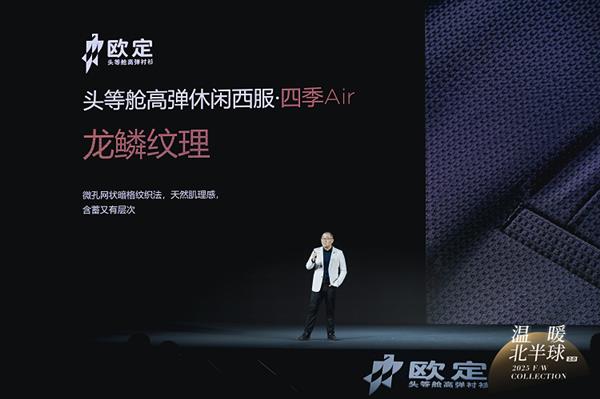 欧定甲等舱高弹衬衫品牌创始人朱家怯于发布会上深度阐述本次欧定冬暖系列新品。